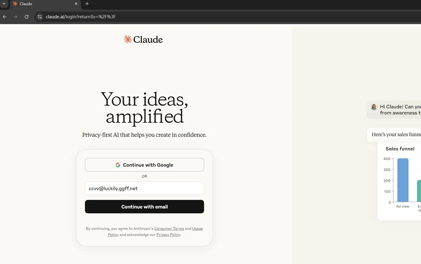 2. 打开 claude 登录界面填入邮箱登录
